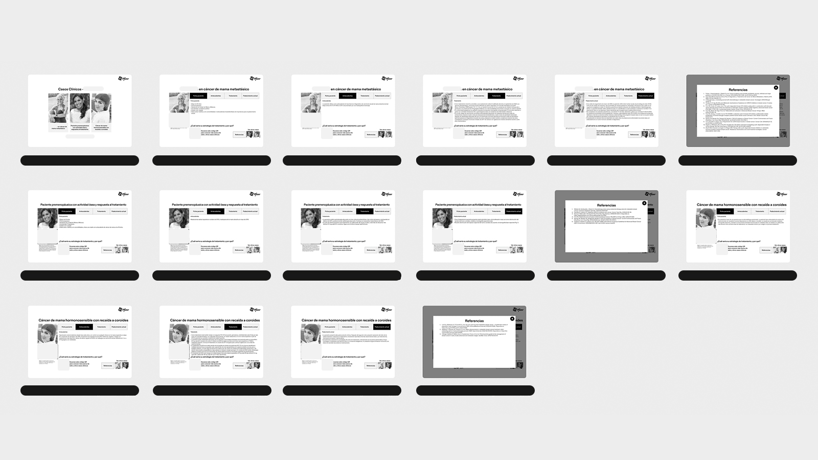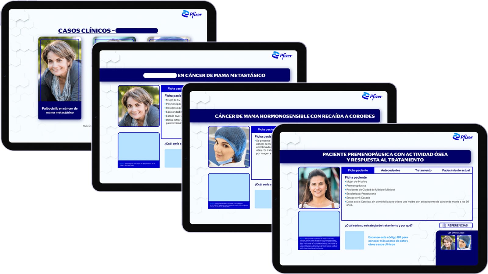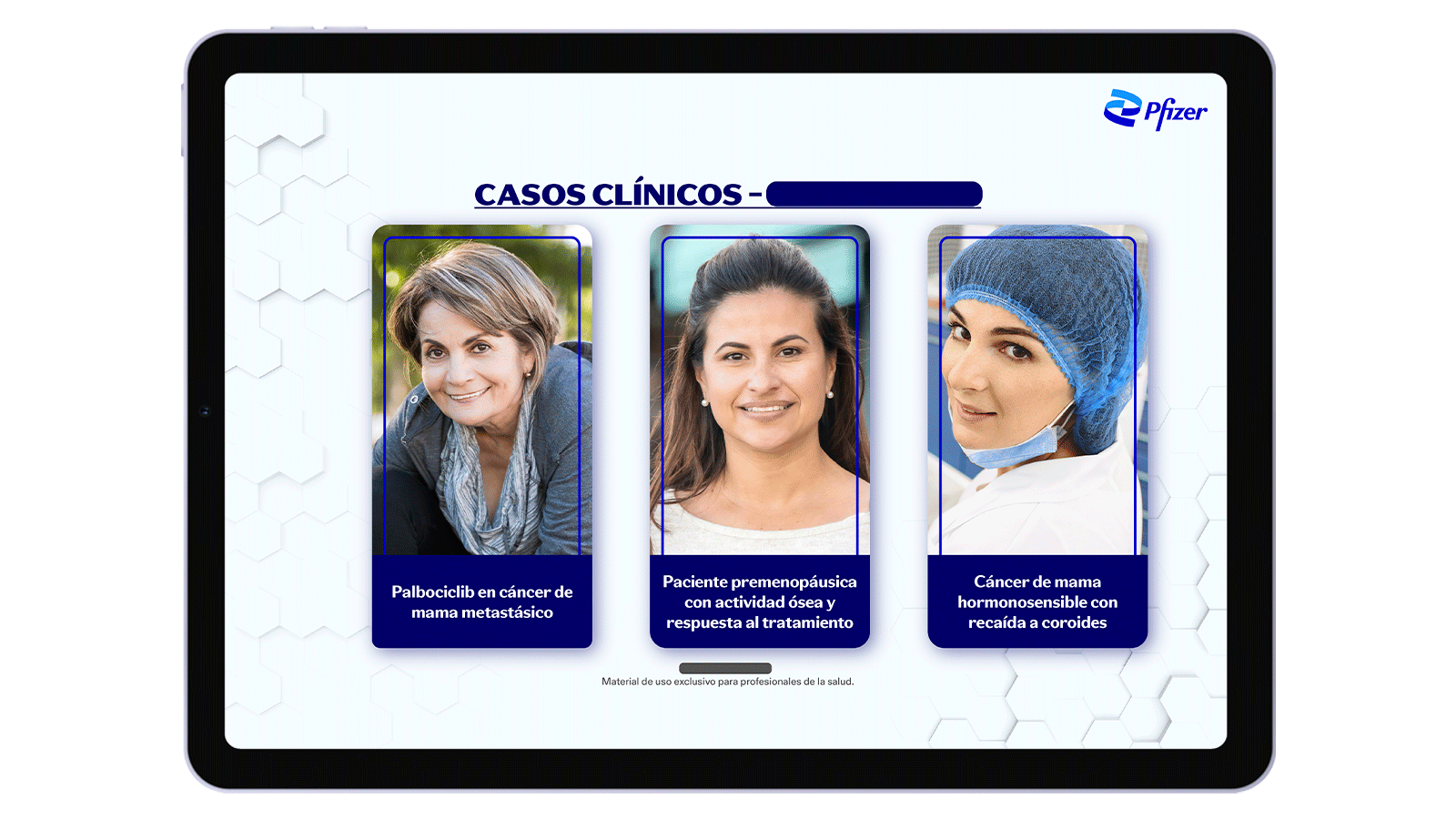 El equipo de oncología de Pfizer México necesitaba presentar casos clínicos hipotéticos a profesionales de la salud sin mostrar ni promover una marca específica de la compañía. Diseñé una solución interactiva que simplificó datos complejos y se integró de forma sencilla en su plataforma CRM.